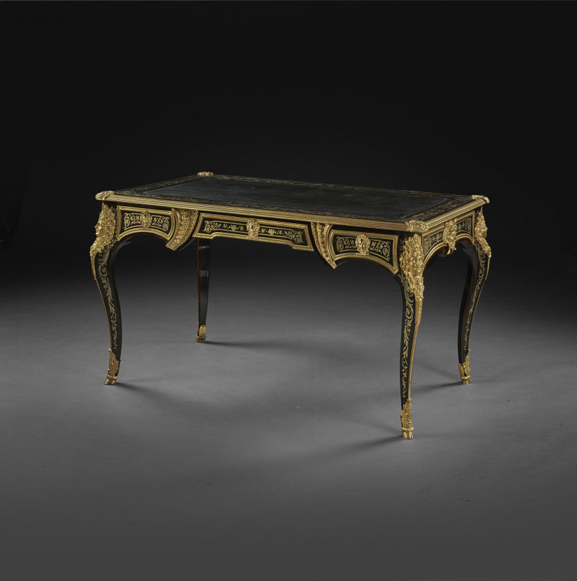 A Louis XIV style gilt-bronze mounted, ebony, tortoiseshell and brass inlaid bureau plat