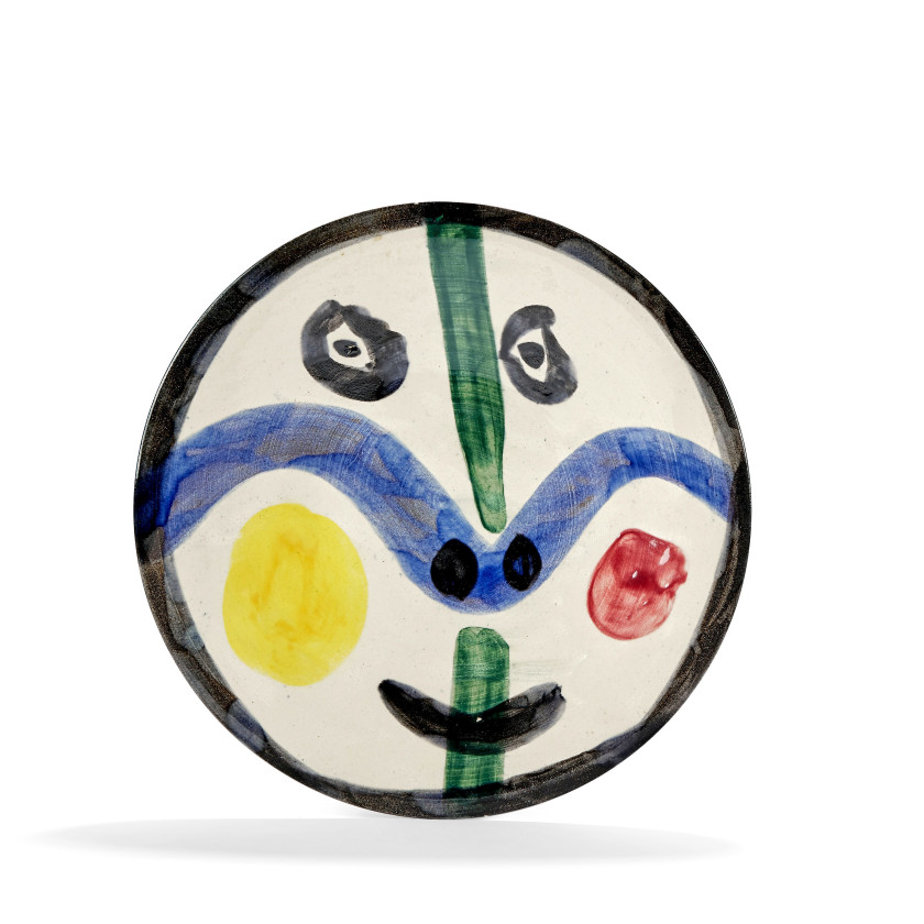 Pablo PICASSO (1881-1973) Visage n°0 - 1963 (AR # 458) Assiette ronde R.A terre de faïence blanche, décor aux engobes et émail sous couverte Bleu, jaune, rose et noir Numérotée "40/500" Edition Picasso et Madoura (inscription) Diamètre : 24 cm