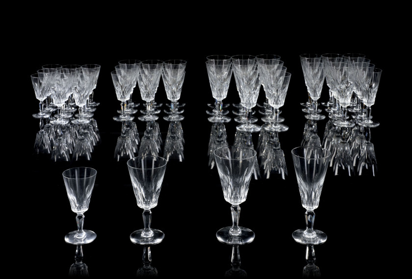 PARTIE DE SERVICE DE VERRES, TRAVAIL DE LA MAISON BACCARAT En cristal taillé, comprenant : - Douze flûtes à champagne - Douze verres à eau - Dix verres à vin rouge - Douze verres à vin blanc Tampon "BACCARAT FRANCE" au revers H. : de 12,5 à 16,4 cm (from 5 to 6 1/2 in.) (46)