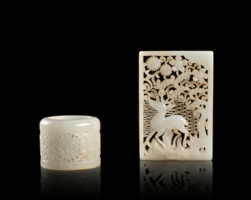 PLAQUE ET BAGUE D'ARCHER EN JADE CÉLADON PÂLE, Chine La plaque sculptée et ajourée d'un daim sous un arbre, la bague d'archer à décor ajouré de caractères et fleurettes H. : 6 et 2,5 cm (2 1/2 and 1 in.)