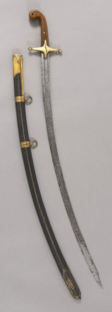 Sabre d'Officier à l'orientale. Poignée en crosse à plaquettes de corne claire. Garde à deux quillons droits, boulés, en laiton. Lame courbe à dos plat, contre-tranchant et pans creux. Fourreau recouvert de maroquin, à coutures métalliques, à deux garnitures et deux bracelets en laiton. ABE. Milieu XIXè siècle (lame piquée, bouterolle en fer pas du modèle). LT : 95 cm Ancienne Collection Jean URS Estimation 400 - 450 €