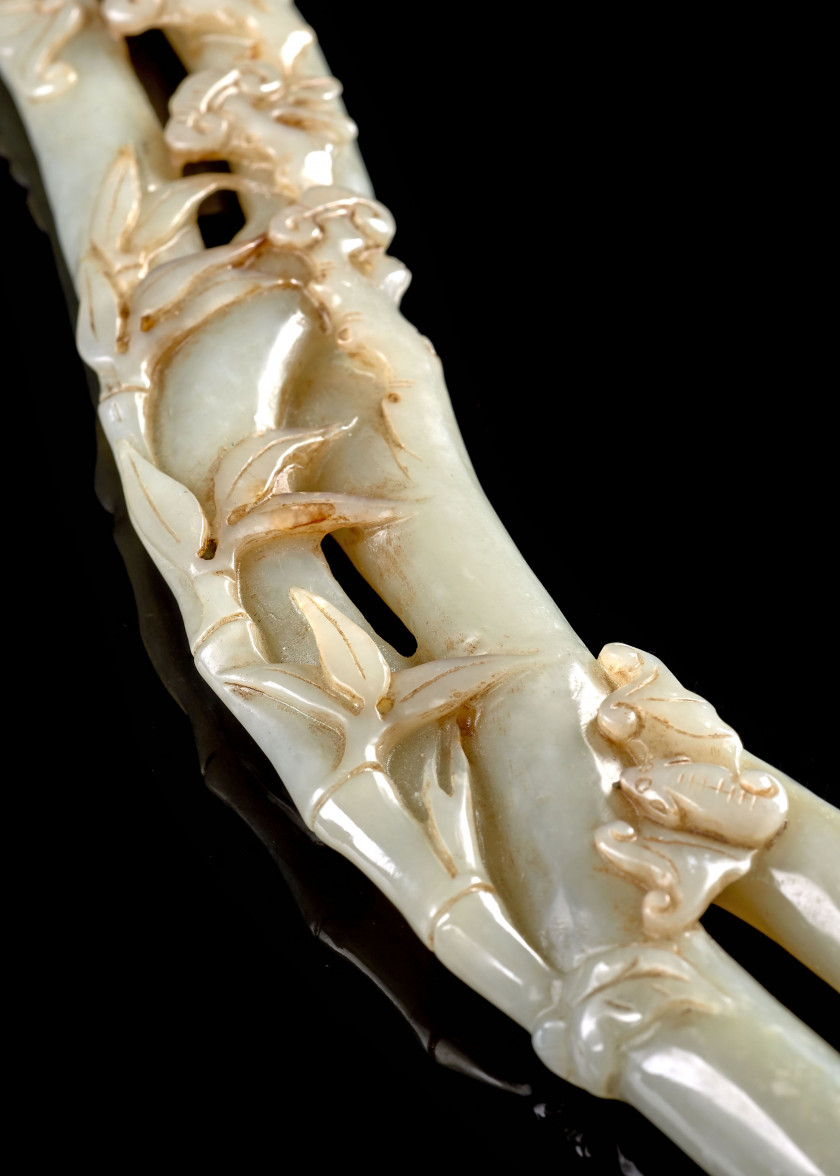 SCEPTRE EN JADE CÉLADON, Chine Le manche formé de deux branches entrelacées, l'une ornée de bambous, l'autre, de lingzhi et de deux chauves-souris, la tête sculptée de pêches et chauve-souris L. : 30 cm (11 3/4 in.)