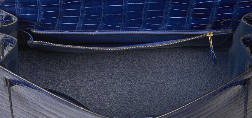 Sac KELLY Sellier 40 Crocodile d'estuaire lisse bleu Saphir (Crocodylus porosus) II/B Garniture métal plaqué or