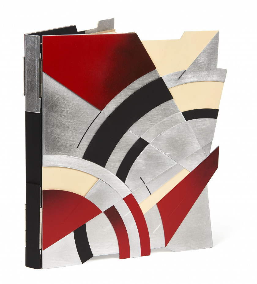 Gr. in-8 (29 x 23,5 cm) monté sur onglets, reliure à charnières piano en aluminium, plats aux chants découpés, décor géométrique d'inspiration Art Déco de plaques d'aluminium superposées, certaines laquées en rouge, noir, crème, d'autres simplement brossées, dos plat agrémenté de pièces en aluminium brossé ou laqué noir, couvertures et dos conservés, boîte (CD - 2012).