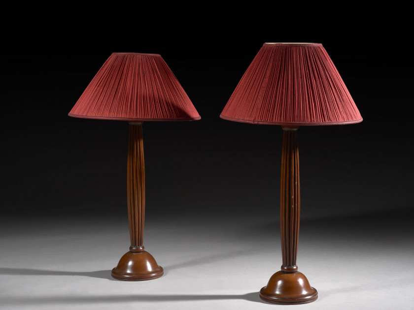 PAIRE DE LAMPES, TRAVAIL MODERNE En bois peint rouge, le fût cannelé ; électrifiées, munies d'abat-jours en tissu plissé rouge H. (sans abat-jours) : 56 cm (22 in.)